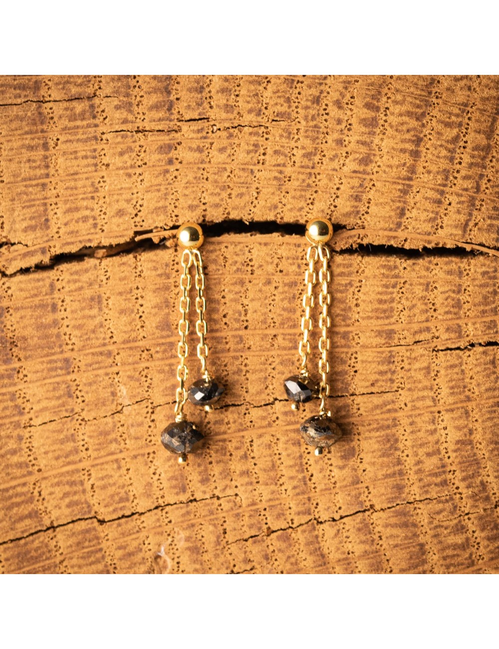 Boucles d'oreilles en Or avec 2 pendants chaînes forçat sur lesquels sont attachés de sublimes Diamants noirs qui semblent presque suspendus dans le vide. Parfaites pour celles qui aiment les bijoux au charme hypnotique et mystérieux.