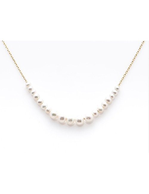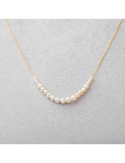 Un délicat jeu de lumière et de finesse. Ce collier en Or 9 carats est orné de perles d’eau douce aux tailles dégradées, soigneusement enfilées sur un fil d’or. Chaque perle dévoile ses reflets nacrés, illuminant le bijou d’une douceur élégante et naturelle. Une création raffinée qui sublime le cou avec grâce et légèreté.