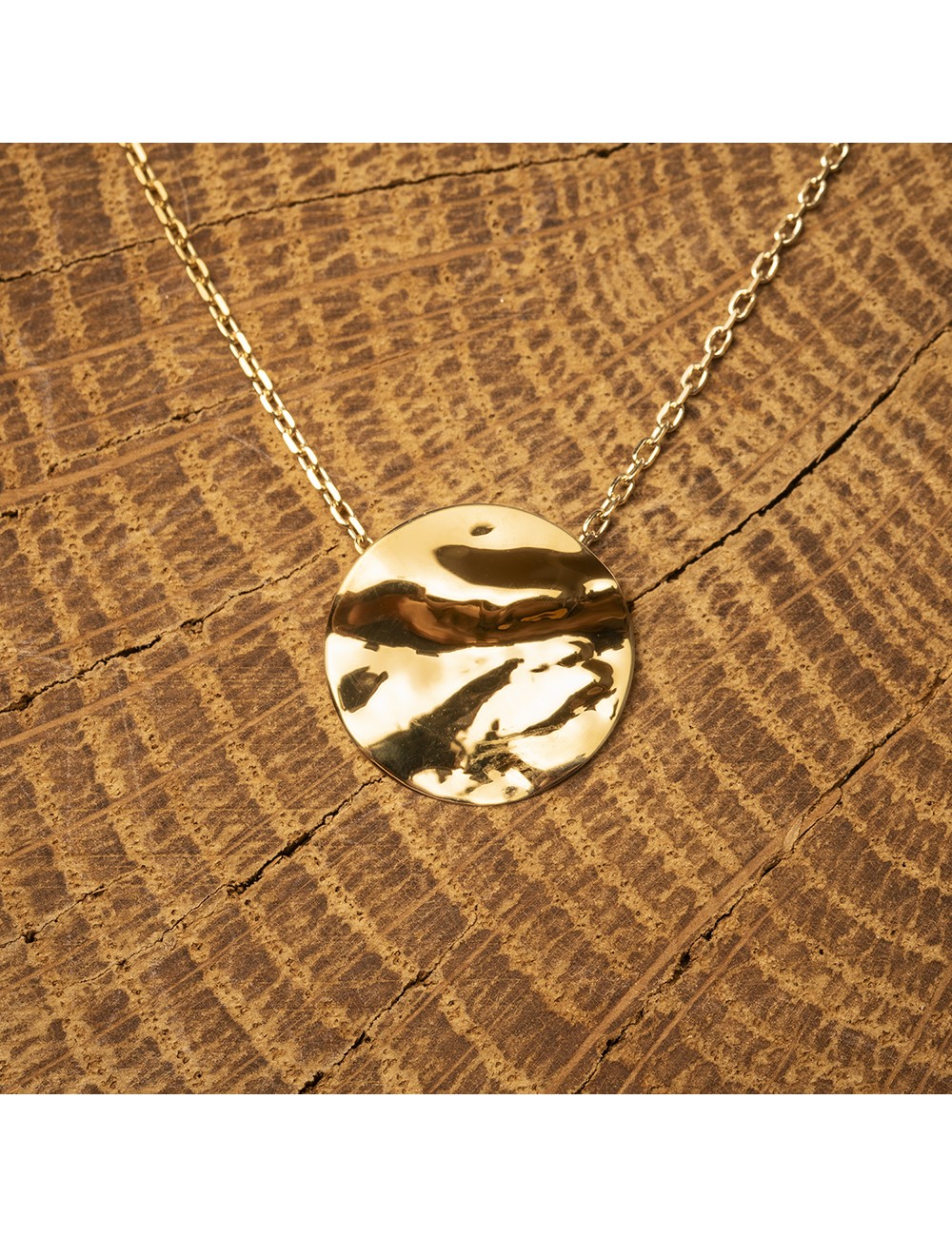 Collier en Or jaune ou en Or blanc composé de 9 petits ronds de 5.5 mm dont le métal a été façonné afin qu'un effet froissé soit révélé.