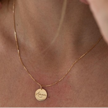 Pendentif avec une gravure "Amour" en Or 18 carats jaune, Rose ou Blanc, dans une élégante typographie manuscrite. Un bijou idéal pour exprimer son amour éternel à sa.son partenaire.