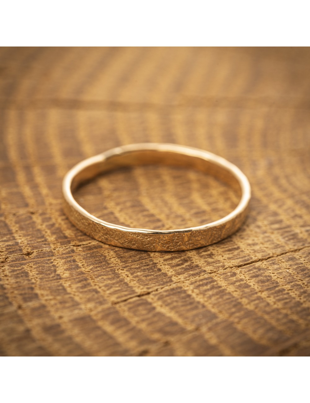 Alliance en Or 18 carats, au style grunge, qui se distingue par son fini brut. L’or, travaillé de manière irrégulière, évoque une texture presque usée. Cet effet grunge confère à la pièce une authenticité unique, parfaite pour ceux et celles qui souhaitent célébrer leur engagement avec un bijou qui sort de l’ordinaire.