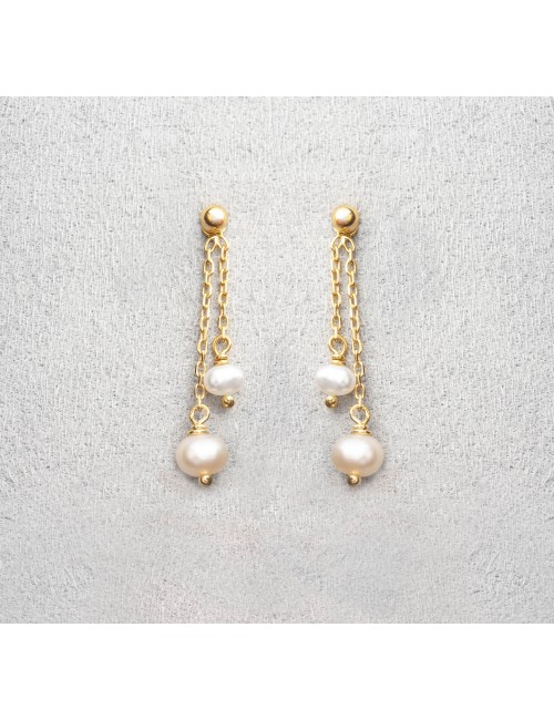 Au creux du lobe, une boule brillante en Or 18 carats capte la lumière avec éclat. De là descendent deux chaînettes forçats limées, de longueurs différentes, fines et aériennes. À leur extrémité, une perles d’eau douce flottent avec grâce, comme deux gouttes nacrées en suspension. Le contraste entre l’or poli et la douceur laiteuse des perles crée un équilibre tendre et lumineux. Un bijou tout en fluidité, qui évoque le silence d’un matin clair, la légèreté d’un geste retenu.