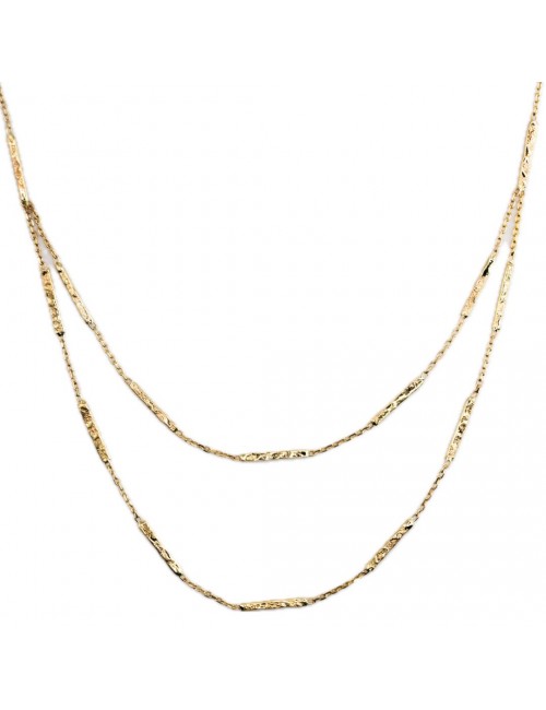 Ce collier double rang en Or 18 carats révèle une allure audacieuse avec sa finition grunge, texturée et pleine de caractère. Les deux chaînes s’entrelacent sans jamais se confondre, créant une superposition maîtrisée, à la fois brute et élégante. Un bijou à l’esprit libre, pour celles et ceux qui osent une élégance hors des codes.