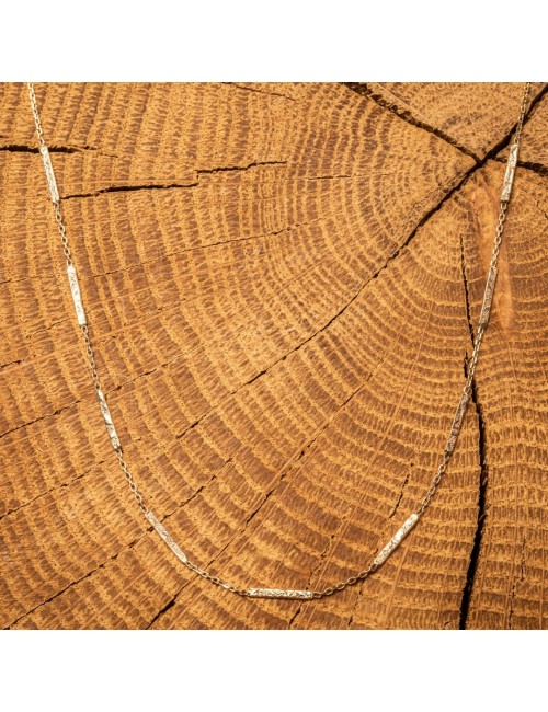 Élégant collier en Or Tricolore 18 carats composé de fils Grunges espacés par une chaîne forçat limée. Plutôt que de briller avec une surface lisse, l'or Grunge présente une texture rugueuse presque vieillie, parfait pour celles qui aiment le Charme de l'ancien.